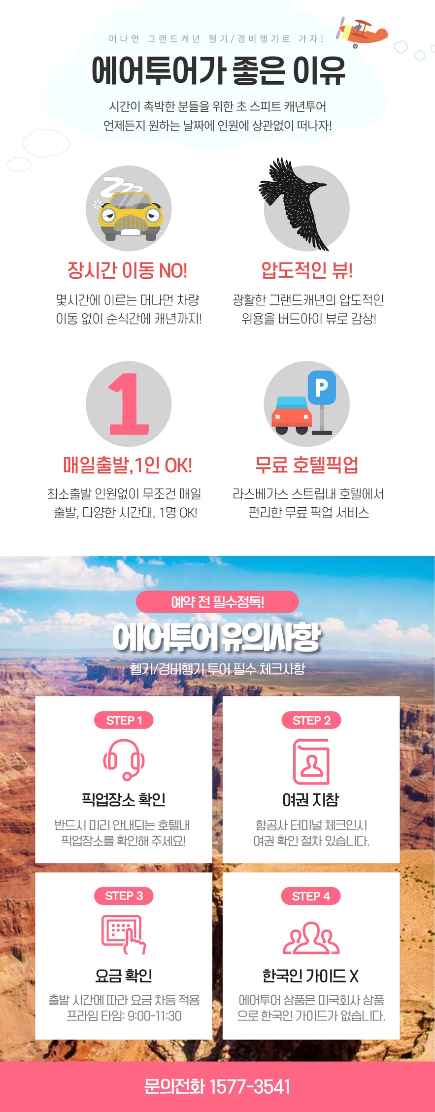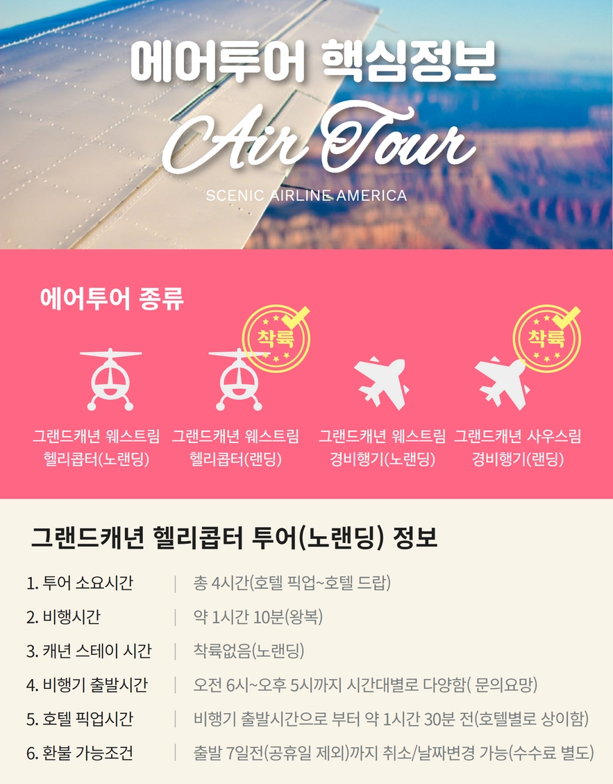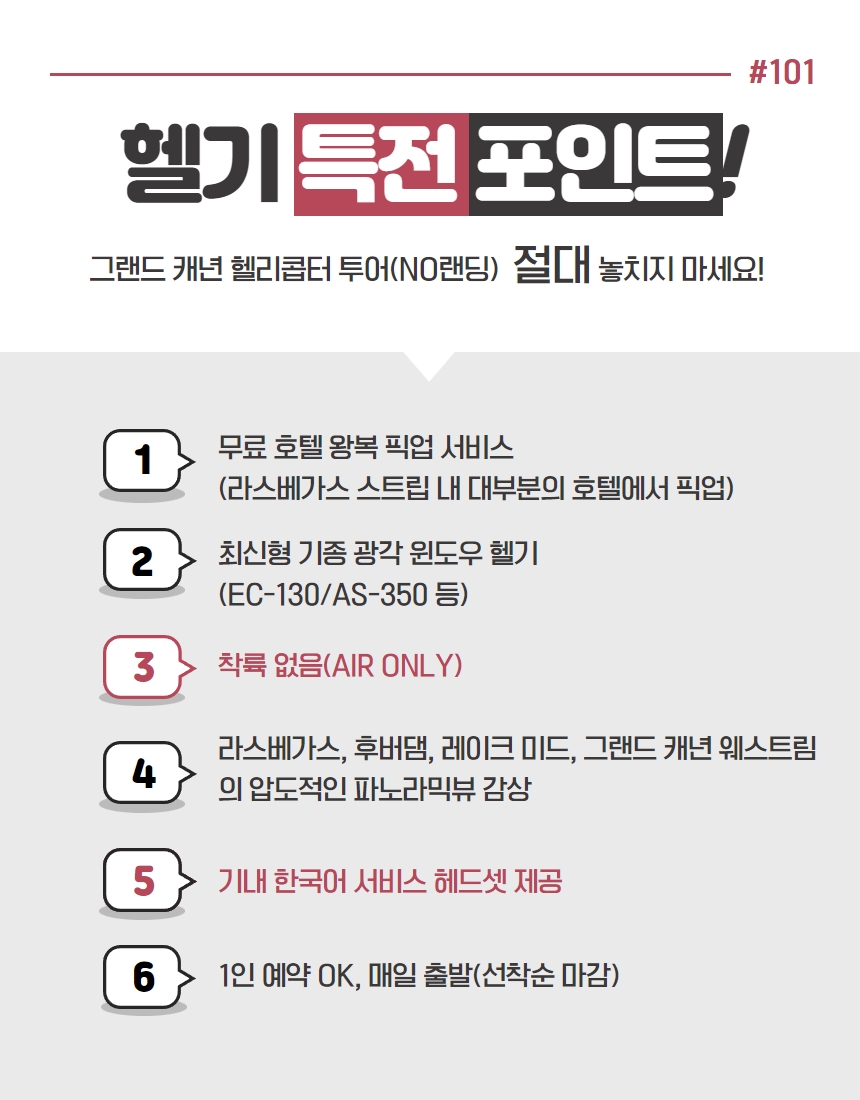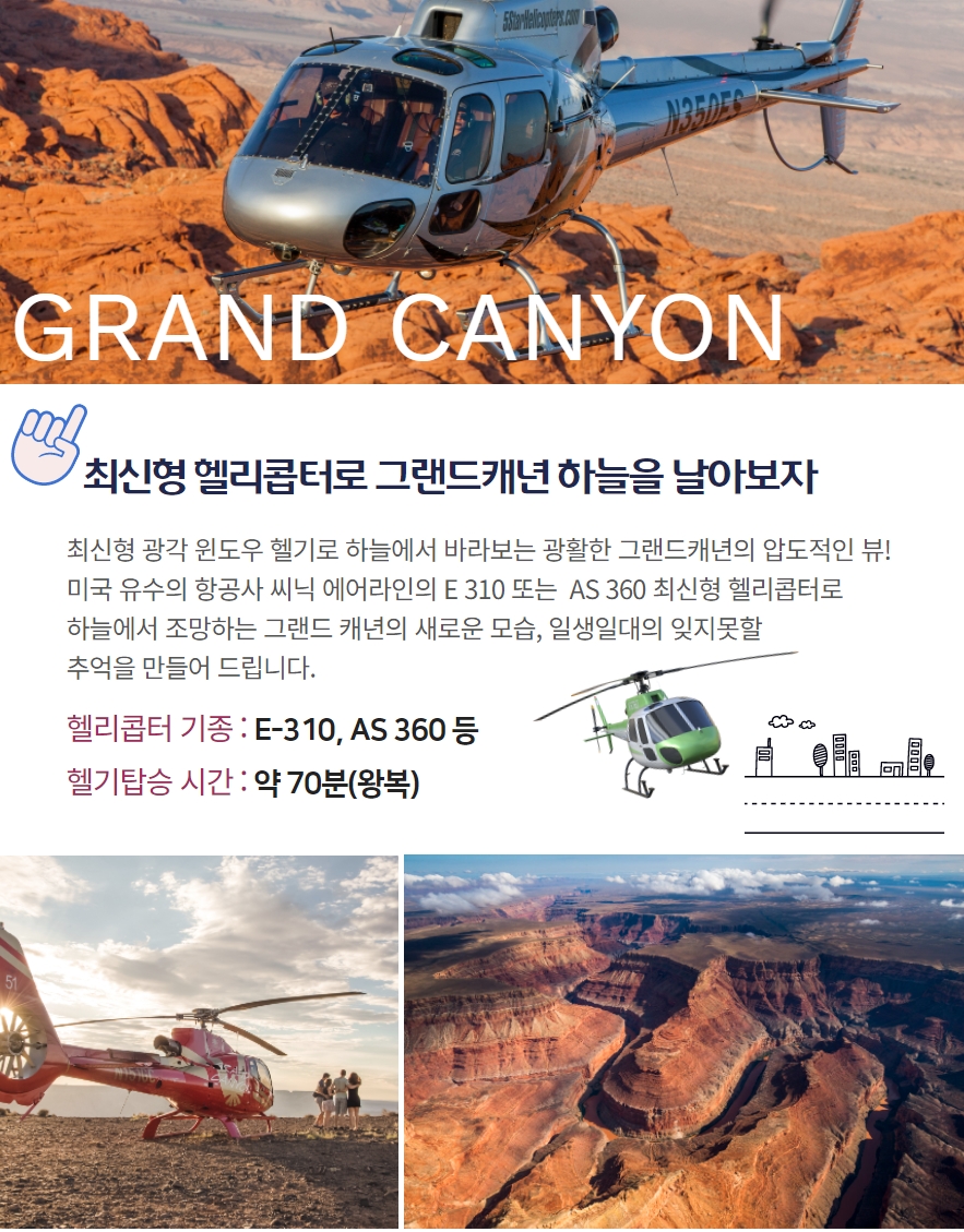 헬리콥터 투어의 경우 추가 요금으로 현장에서 앞자리 업그레이드가 가능하며 탑승 수속시 "Front seat upgrade, please"라고 말하시면 됩니다.