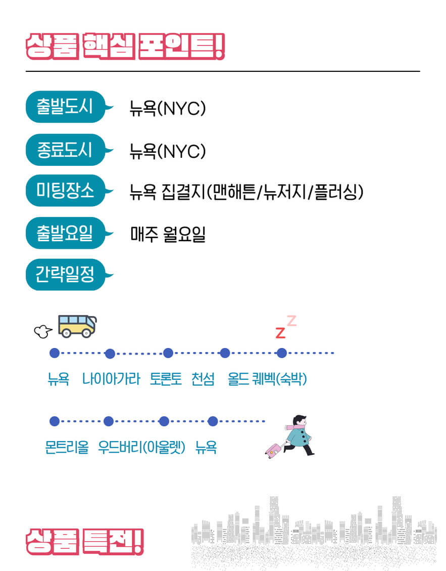 *뉴욕 집결지는 맨해튼/플러싱/뉴저지 등으로 상품별로 상이하오니 해당 일정표를 참조해 주세요.*합류 상품의 경우 미팅 포인트마다 다른 지사별 예약 손님들 조인되어 진행되는 점 양해 부탁드립니다.