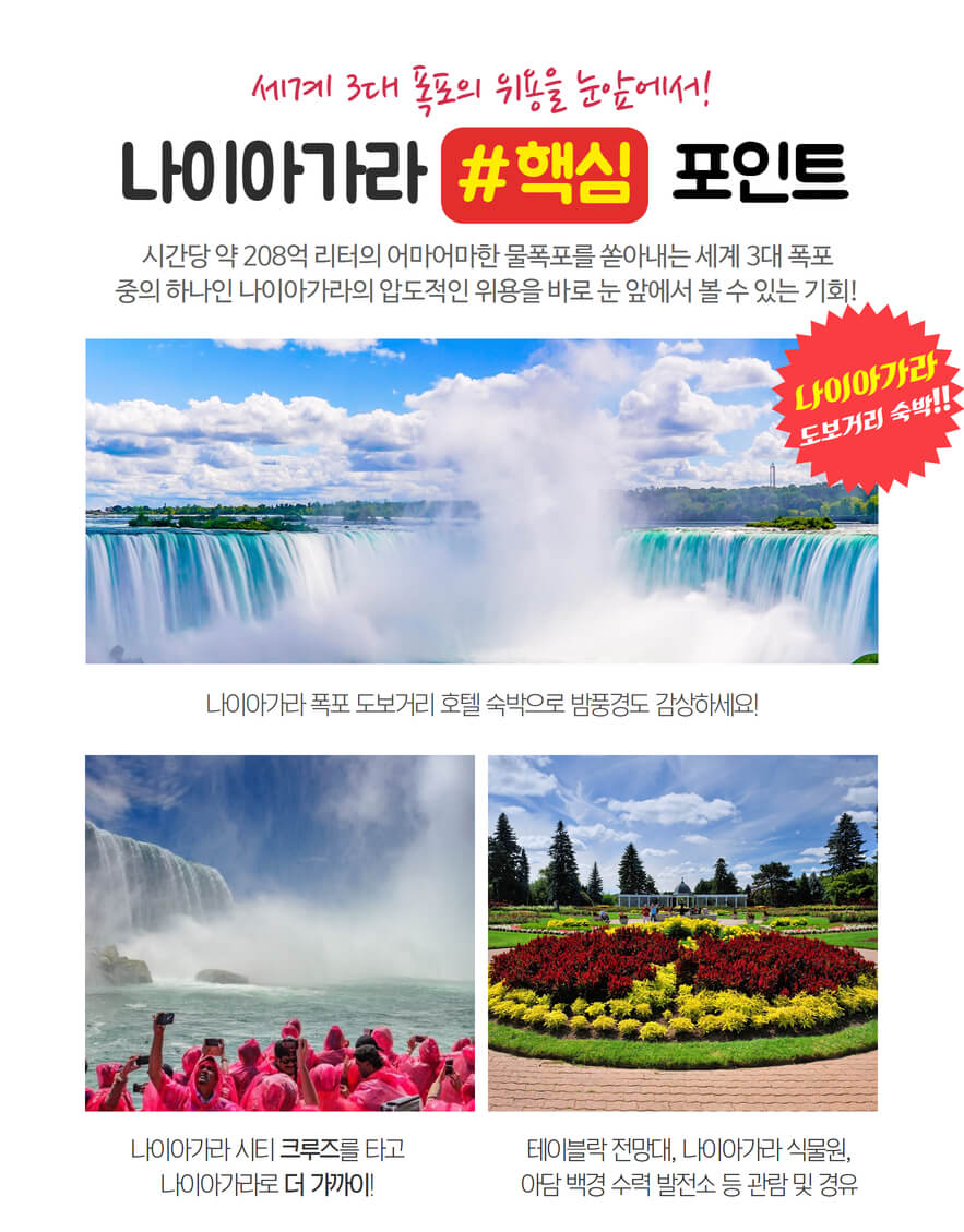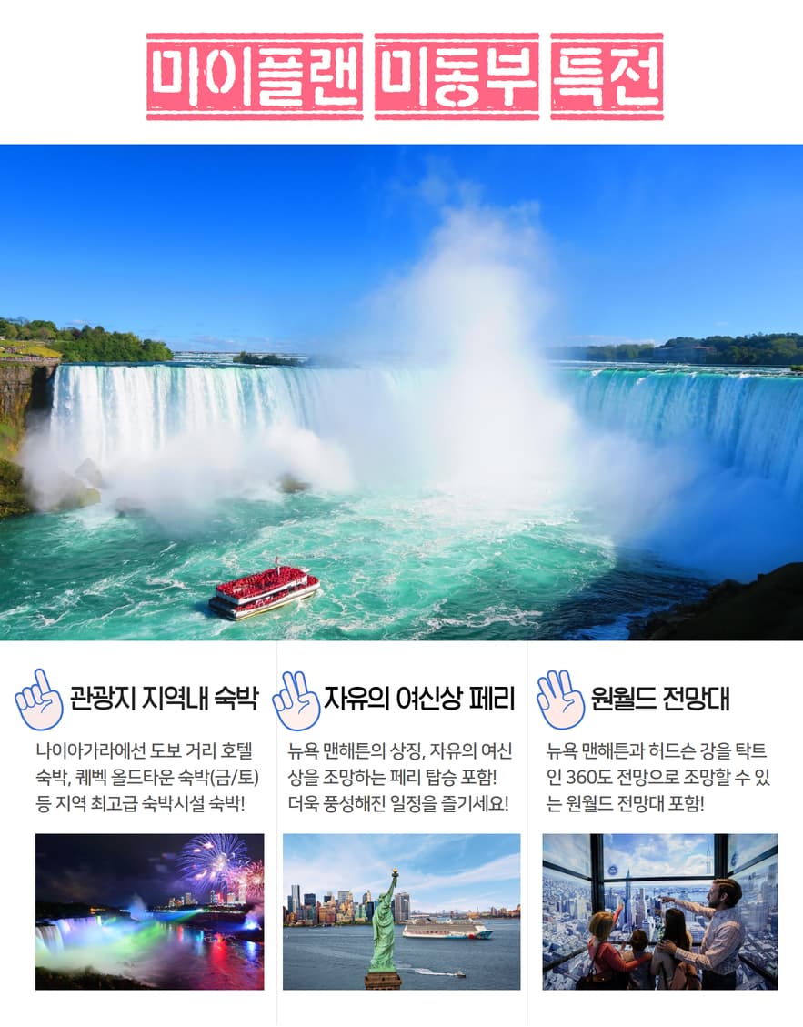 • [관광지 입장료 포함 사항] ☞나이아가라 시티 페리 탑승(하절기) 또는 시닉터널(동절기) ☞뉴욕 원월드 전망대 입장료 ☞뉴욕 자유의 여신상 페리(하선 없음)