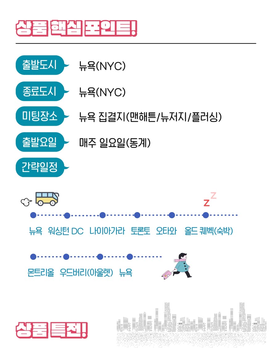 *뉴욕 집결지는 맨해튼/플러싱/뉴저지 등으로 상품별로 상이하오니 해당 일정표를 참조해 주세요.*합류 상품의 경우 미팅 포인트마다 다른 지사별 예약 손님들 조인되어 진행되는 점 양해 부탁드립니다.