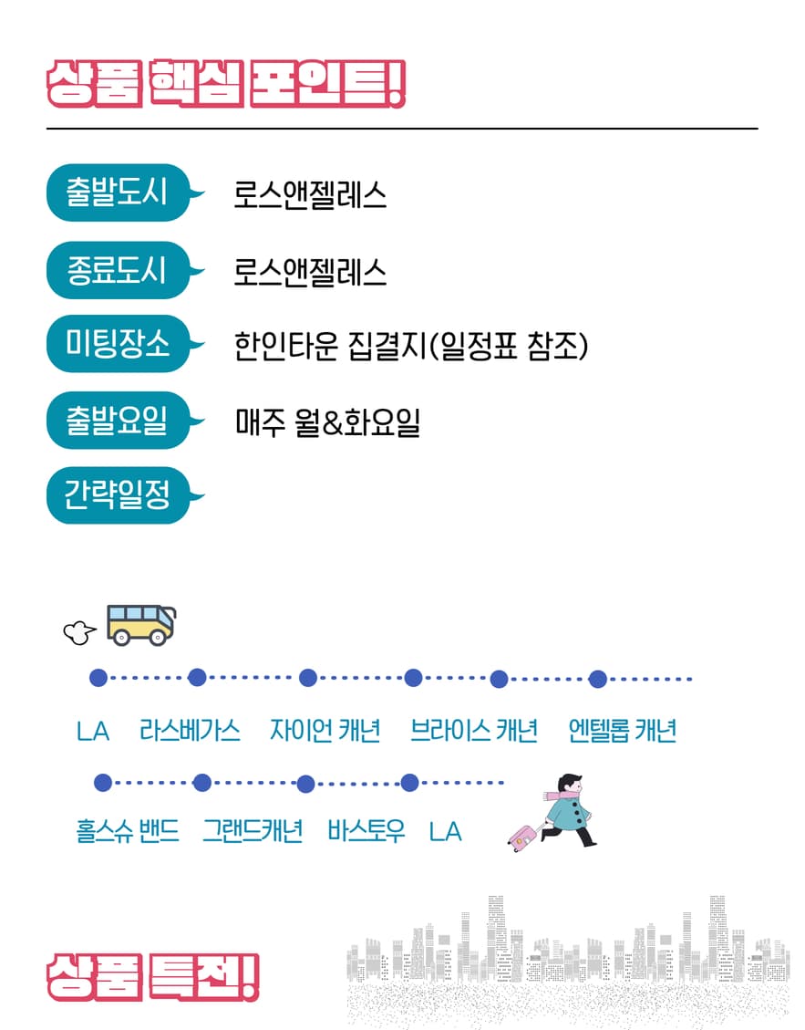 🎈 핵심 방문지 정보 ✔️ 거대한 사막 위의 오아시스 라스베가스 ✔️ 신의 성지라 불리는 웅장한 자이언 캐년 ✔️ 아름다운 첨탑의 향연 브라이스 캐년 ✔️ 빛과 바람이 만든 예술 엔텔롭 캐년(입장료 별도) ✔️ 거대한 말발굽 모양의 협곡 홀스슈 밴드(선택관광) ✔️ 미국 서부 대륙의 최대 관광지 그랜드 캐년 국립공원