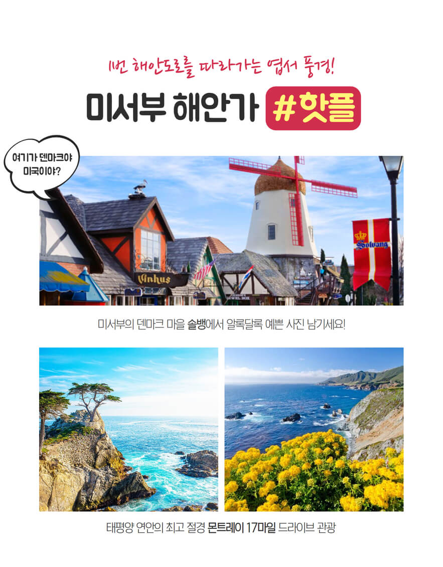 🎈 핵심 방문지 정보 ✔️ 거대한 사막 위의 오아시스 라스베가스 ✔️ 신의 성지라 불리는 웅장한 자이언 캐년 ✔️ 아름다운 첨탑의 향연 브라이스 캐년 ✔️ 빛과 바람이 만든 예술 엔텔롭 캐년(입장료 별도) ✔️ 거대한 말발굽 모양의 협곡 홀스슈 밴드(선택관광) ✔️ 미국 서부 대륙의 최대 관광지 그랜드 캐년 국립공원 ✔️ 자유와 낭만의 도시 샌프란시스코 ✔️ 경이로운 자연 유산 요세미티 국립공원 ✔️ 북서부의 명문대 UC버클리 캠퍼스 투어 ✔️ 미국 안의 덴마크 마을 솔뱅 ✔️ 미국에서 가장 아름다운 해안도로 17마일