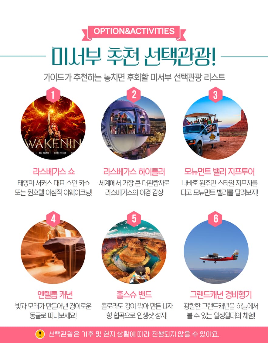 • 📍라스베가스에서 합류하는 고객의 경우 일정 및 식사의 생략이 있을 수 있으며, 이에 대한 요금 환불은 없습니다.