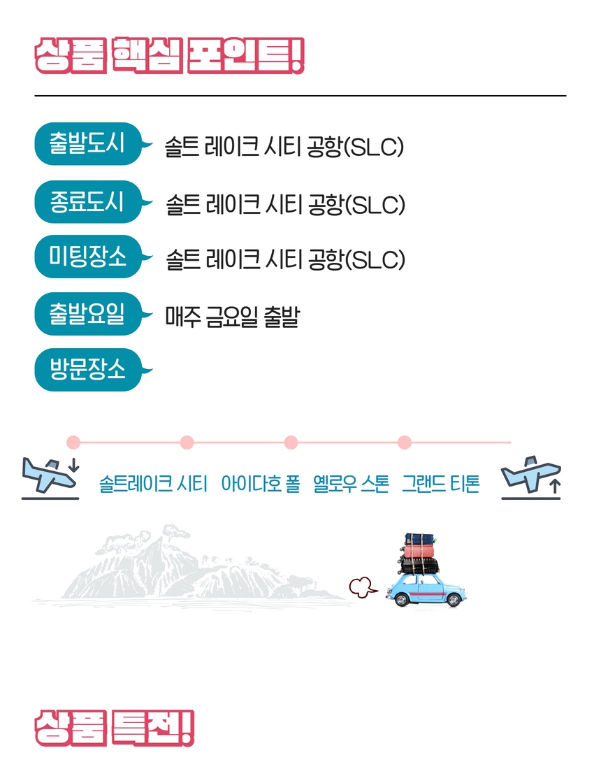 • 📍해당 상품은 솔트레이크 시티 공항에서 집결하여 출발하는 상품으로 일체의 항공료는 포함되어 있지 않습니다.
