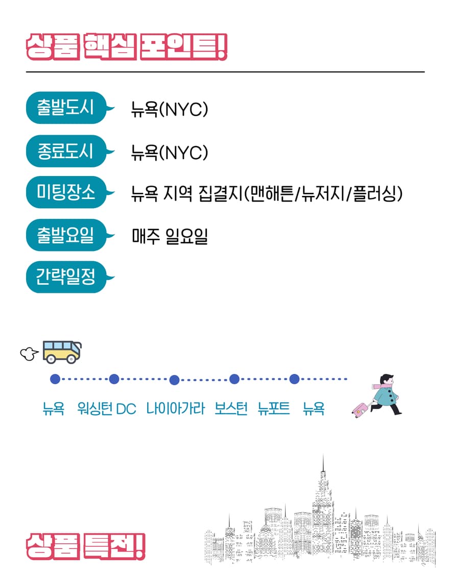 *뉴욕 집결지는 맨해튼/플러싱/뉴저지 등으로 상품별로 상이하오니 해당 일정표를 참조해 주세요.*합류 상품의 경우 미팅 포인트마다 다른 지사별 예약 손님들 조인되어 진행되는 점 양해 부탁드립니다.