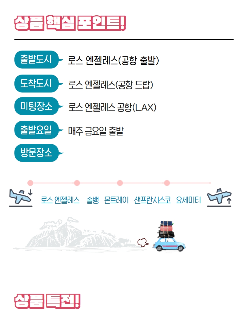 🎈 핵심 방문지 정보 ✔️ 세계 영화의 중심지 헐리우드 거리 ✔️ 자유와 낭만의 도시 샌프란시스코 ✔️ 경이로운 자연 유산 요세미티 국립공원 ✔️ 미국 IT 산업의 메카 실리콘 벨리 ✔️ 미국 안의 덴마크 마을 솔뱅 ✔️ 미국에서 가장 아름다운 해안도로 17마일 ✔️ 라라랜드 촬영지 그리피스 천문대 ✈️ 권장 항공편 ▶가는날: KE0017 LAX 09:40 도착편 권장 ▶오는날: KE0012 LAX 23:50 출발편 권장 ※항공권을 개별적으로 구매해 오시거나 국내선으로 이동하시는 분들은 권장 항공편 시간대에 맞춰서 발권하시면 됩니다.(문의: 1577-3541)