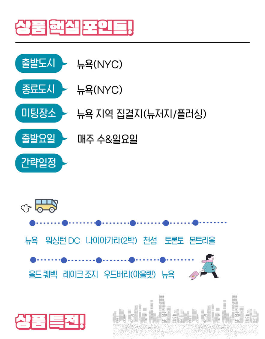 *뉴욕 집결지는 맨해튼/플러싱/뉴저지 등으로 상품별로 상이하오니 해당 일정표를 참조해 주세요.*합류 상품의 경우 미팅 포인트마다 다른 지사별 예약 손님들 조인되어 진행되는 점 양해 부탁드립니다.