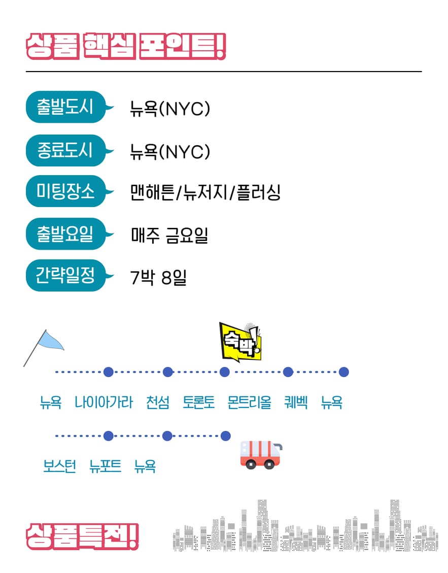 *뉴욕 집결지는 맨해튼/플러싱/뉴저지 등으로 상품별로 상이하오니 해당 일정표를 참조해 주세요.*합류 상품의 경우 미팅 포인트마다 다른 지사별 예약 손님들 조인되어 진행되는 점 양해 부탁드립니다.